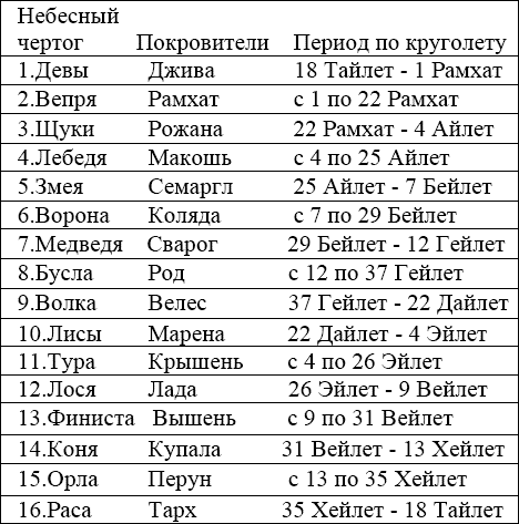 Путём несложных вычислений вначале определим даты Сварожьего круга в современном летоисчислении, зная о том, что 1 Рамхат – 1 Сентября, и именно с этого дня начинается каждое новое лето, то есть Новый год в современном понимании начинается с 1 сентября каждого года. Далее на основе того, что для "Короля жезлов – Льва – Раса" идеальный союзы чертоги «Змея» и «Орла», и, приняв во внимание, что для Короля Жезлов активный принцип воли преобладающий, то руководствуясь логикой и "законом о Божественной экономии" чертоги «Змея» и «Орла» – это чертоги с преобладанием пассивного принципа силы воли – чаши. То есть Королева Чаш – чертог «Орла», Принцесса Чаш – чертог «Змея», что доказывает при сравнении идентичность Фигурных Арканов Таро и Сварожьего круга небесных чертогов Праславян.