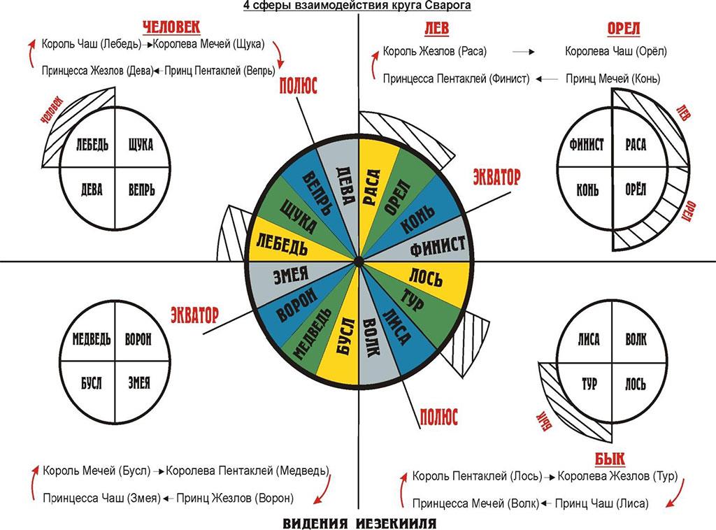 При дальнейшем анализе, наблюдаем для каждого из Королей в движении по часовой стрелке 4 сферы взаимодействия. Для короля чаш – королева мечей, принц пентаклей, принцесса жезлов. Для короля жезлов – королева чаш, принц мечей, принцесса пентаклей. Для короля пентаклей – королева жезлов, принц чаш, принцесса мечей. Для короля мечей – королева пентаклей, принц жезлов, принцесса чаш. В контексте с данными сферами взаимодействия так называемое «видение иезекииля» как и рассказ Рэймонда Фишера Джоунса «Уровень шума» несут один и тот же посыл для расшифровки древнего знания предков человечества. По аналогии, учитывая изображение 21 аркана Фальконнье как и Уэйта, наблюдаем взаимосвязь между тотемными знаками круга сварога 16-ти ф.а.к.т., а именно:
