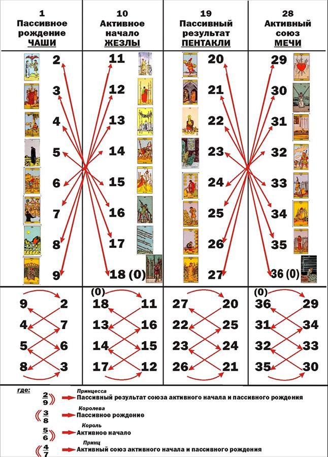 Далее, при скрупулёзном анализе астрологических символов 22-х старших арканов карт таро Фальконнье как и символов букв алфавита магов (расшифровку я приведу в следующей книги ввиду порционного изложения информации накопленной мною за 18 лет изучения данной темы) – цифры от 2 до 9 несут определённый смысл: