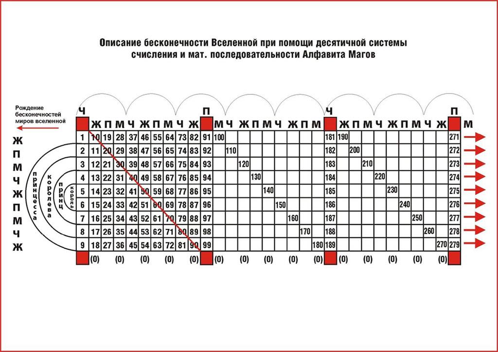Как мы видим, данная таблица напоминает резьбу с перегородками при шаге в 81=9*9. Математическая модель вселенной, в описании десятеричной системы счисления, напрямую связана с русским языком и алфавитом магов, так как для 1-го старшего аркана таро – в соответствии букв – а, я – т. е. окончания слов женского рода – нечётные 3,5,7,9 – означают пассивное рождение – магнетизм; для 10 старшего аркана таро, в соответствии букв – и, й, ы – т. е. окончания слов мужского рода – чётные 2,4,6,8 – означают активное начало – электричество. Ноль, согласно алфавиту магов, соответствует 18 старшему аркану таро, и как бы не показалось странным, всё это возможно объяснить только вспомнив «эффект джанибекова» – когда после двух витков система переворачивается и 19 соответствует 1, где после соответствующих двух витков замкнутость системы в продолжении соответствует 36 (второй ноль), – далее, в продолжении десятеричной системы счисления, всё повторяется до бесконечности.