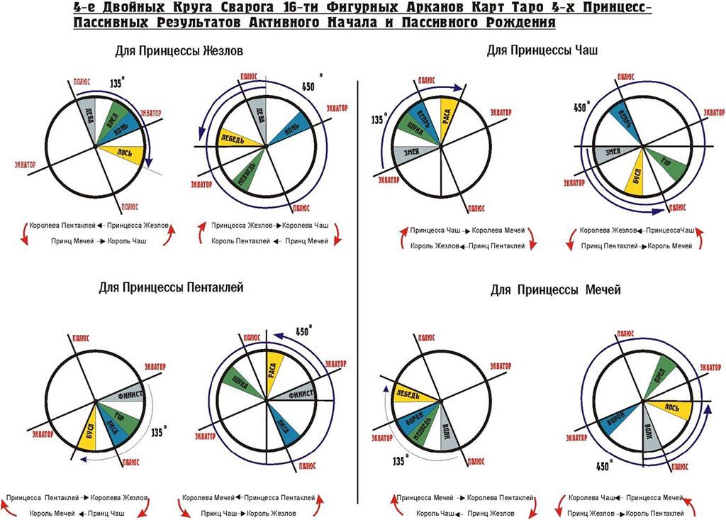 Определив матрицу круга сварога 16-ти ф.а.к.т. взаимодействия 4-х мерного пространства 4-х агрегатных состояний вещества продвинемся далее и создадим теоретическое обоснование логических взаимодействий системы Таро. Рассмотрим график расстановки 16-ти ф.а.к.т. круга сварога, приняв во внимание тот факт, что движение против и по часовой стрелке зависит от точки наблюдения системы вращения, т. е. «петля мёбиуса» движется одновременно как в одну так и в другую сторону. Каждый тотемный знак круга сварога или король, королева, принц, принцесса производит следующего по стихии через 90 градусов сферы против часовой стрелки, и 270 градусов по часовой стрелки; где подобно земной женщины, рождающей ребёнка после зачатия через 270 дней, – то что внизу, подобно тому что вверху.