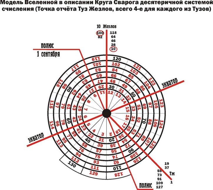Рисунок показывает, что матрица 4-х мерного пространства, помимо приведённых ранее 2-х «петлей мёбиуса», имеет дополнительные направления ещё двух «петлей мёбиуса». При этом 4 Туза – единицы указывают направление обращения солнечной системы относительно 4 тузов – единиц со значками направления вращения галактики млечный путь; помимо этого 4 десятки указывают направление обращения галактики млечный путь относительно 4 десяток со значками направления вращения скоплений галактик. Т. е. 4 туза и 4 туза со значками, 4 десятки и 4 десятки со значками, – являются каркасом 4-х систем движения, разъяснение в следующей главе. Учитывая сферу в 360 градусов с точкой отсчёта весеннего равноденствия (читайте следующую главу) – туз жезлов – создадим модель вселенной в описании круга сварога при помощи десятеричной системы счисления, учитывая «пульс эффекта джанибекова».