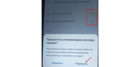 3. В приложении Яндекс. Диск на смартфоне в настройках в разделе «фото» включаем безлимит для сохранения и автозагрузку фотографий.