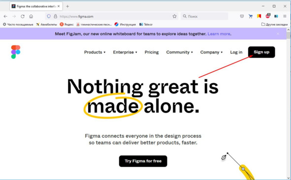 Запускаем любой из браузеров, которым вы пользуетесь. Стрелкой указано поле, которое называется адресной строкой. Вот в это поле необходимо ввести следующий адрес https://figma.com и нажать «Enter» на клавиатуре (если вы пользуетесь печатной версией этой книги, то набирайте такой адрес https://figma.com). Открывается начальное окно. В нём необходимо нажать кнопку, указанную по стрелке.