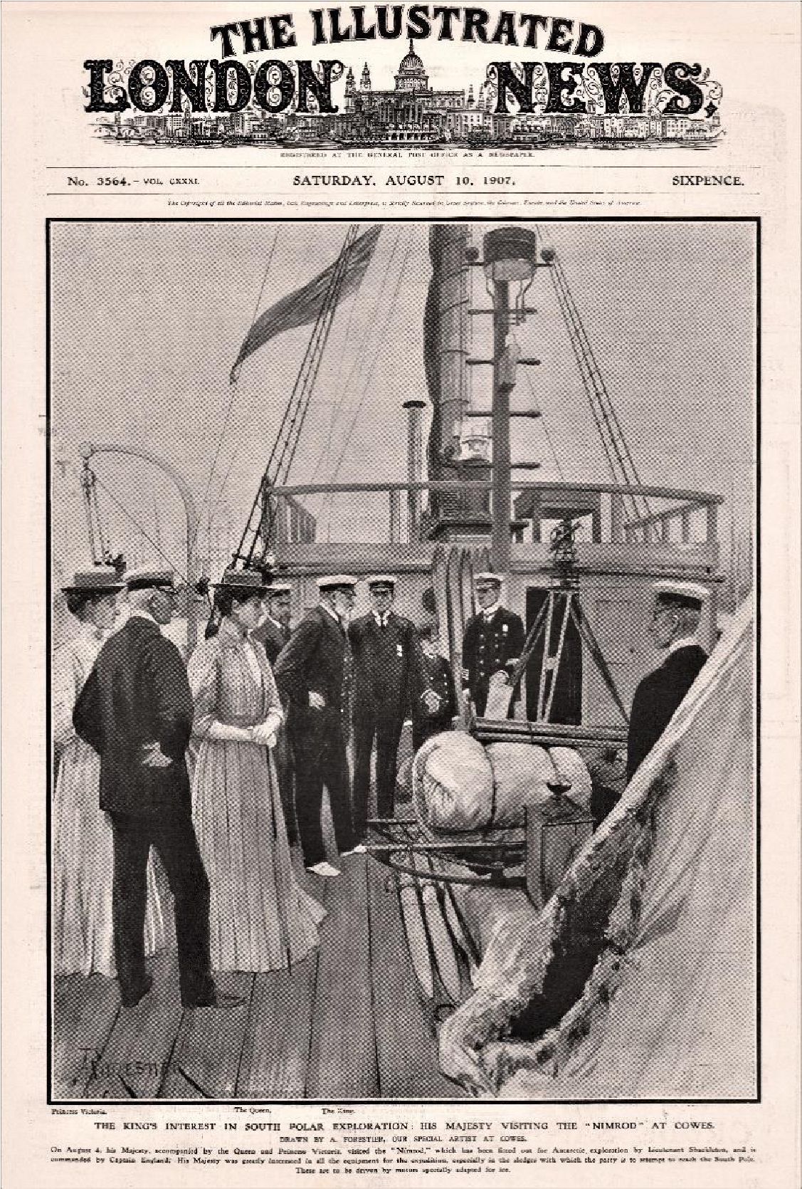 В воскресенье, 4 августа, корабль был осмотрен в Соленте Королем Эдуардом и Королевой Александрой в сопровождении Принца и Принцессы Уэльских, Герцога Коннаутского и других членов королевской семьи. Сэр Эрнест Шеклтон (тогда лейтенант) получил по этому случаю Викторианский орден, а также Юнион Джек от Королевы Александры, который должен был отправиться в южное путешествие. «Нимрод» отплыл из Торки 6 августа (Эрнест Шеклтон в своей книге «В сердце Антарктики» указывает иную дату отплытия из Торки – 7 августа 1907 года) и прибыл в Литтелтон, Новая Зеландия, 23 ноября.