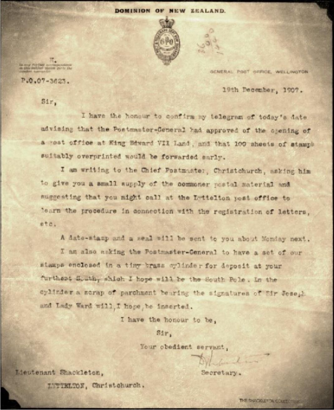 В письме от 19 декабря 1907 года Секретарь Почтовой службы Новой Зеландии Д. Робертсон сообщил Лейтенанту Шеклтону, что Генеральный Почтмейстер одобрил открытие почтового отделения на Земле Короля Эдуарда VII и что 100 листов марок с соответствующей надпечаткой будут отправлены заблаговременно.