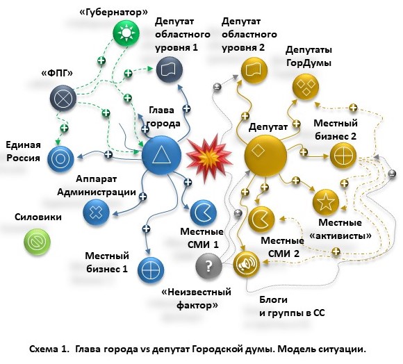 7. Неизвестный фактор. На всякий случай, заложим в наш анализ такую потенциальную возможность, как появление неизвестного фактора. Информация о нем отсутствует (в открытых источниках). Но не исключено, что существуют некие политические субъекты, чья поддержка депутата направлена на дестабилизацию ситуации в муниципалитете, что позволит привести во властные структуры города своих людей. На уровне гипотезы можно предположить, что эти политические субъекты являются своеобразными гарантами депутата для местных предпринимателей (местный бизнес 2