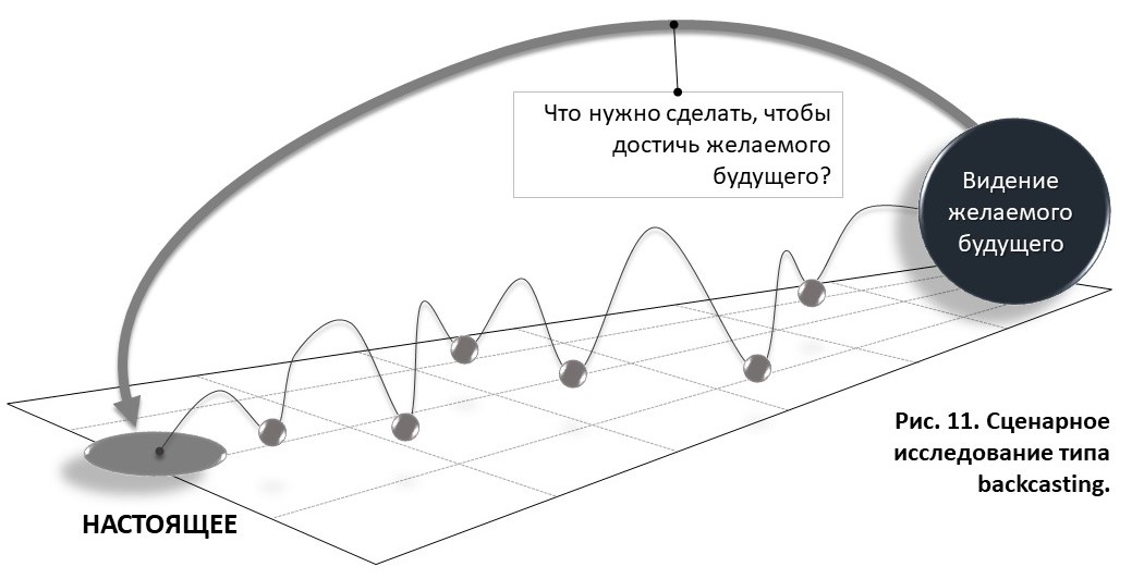 2). «Трендовый и обратный сценарии». В современной практике выделяется два основных подхода к разработке сценариев[13]. Это обратное прогнозирование, или backcasting. При этом подходе сценарии строятся как бы в обратном порядке. Для начала формулируется некоторое видение будущего, а в процессе разработки сценария необходимо построить цепочку связанных во времени событий, реализация которых приведет к заданному будущему состоянию (рис. 11). По сути задается будущее состояние системы и определяются способы его достижения.