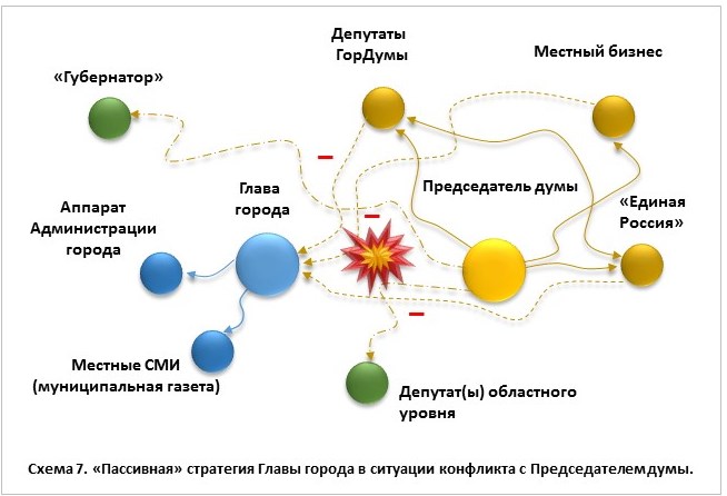 Рассмотрим это на нашем примере: глава города vs председатель думы. Допустим, глава решил никак не реагировать[14]. Применительно к проведенному нами выше анализу ситуации это означает, что глава никак не использует кластеры, центром которых он является, не взаимодействует с внешними факторами для осуществления воздействия как прямо на председателя, так и на связанные с ним структуры (см. схему 7).