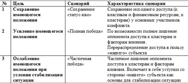 3. Помимо выделенных нами целей, участники проблемной ситуации могут иметь и другие. Так, например, конфликт может стать своеобразным предметом торга с внешними кластерами для карьерного роста. И в этом случае цель полной победы для главы будет формулироваться совершенно иначе – переход в вышестоящую структуру (например, в правительство субъекта). Тем не менее сама логика формулировки трех вариантов сценариев и сценарных целей более чем достаточна для обратного прогнозирования.