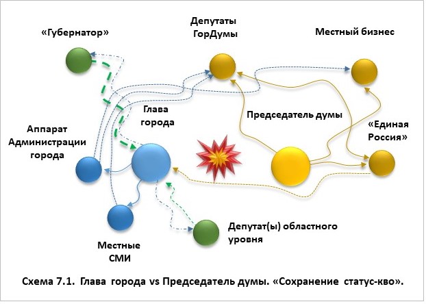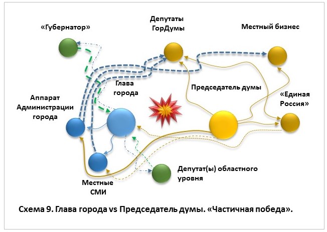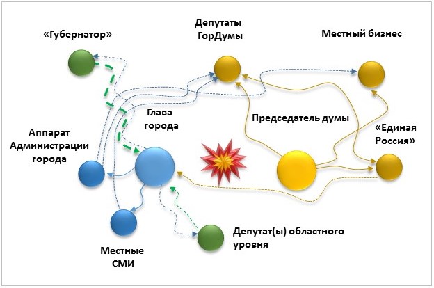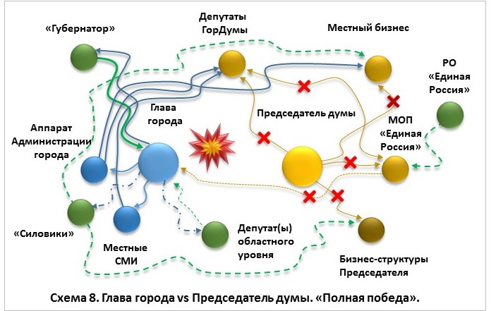 Применительно к конфликту между главой и председателем это может выглядеть следующим образом – глава получает контроль над депутатами, что в свою очередь может означать избрание нового председателя, переизбрание руководящего состава местного отделения «Единой России» (местный политсовет, руководитель местного исполкома) и, как следствие, выборы нового секретаря местного отделения, а также переизбрание руководителя фракции «ЕР» в гордуме. По линии бизнеса – получение поддержки местных предпринимателей для решения городских проблем, с одной стороны, и возникновение сложностей в бизнес-структурах председателя.