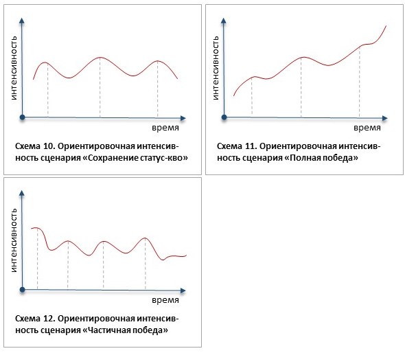 Как только что было отмечено, каждый конфликт обладает разной скоростью своего протекания. Это касается и интенсивности реализации сценариев. Каждая из рассмотренных нами вариаций предполагает различную интенсивность (см. схемы 10–12) своего воплощения. Так, например, сохранение статус-кво обладает средней скоростью, поскольку в большей степени ориентировано на мягкое воздействие.