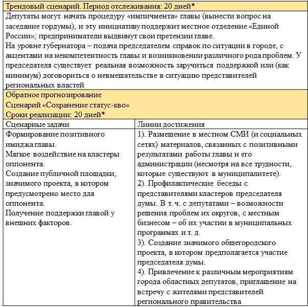 По п. 3. Наш анализ показал, что влияние председателя основывается на контроле (в большей или меньшей степени) над депутатами гордумы, местным отделением «Единой России», а также его связях с местным бизнесом. Для сценария № 3 возможно несколько вариантов работы с этими факторами, например, когда глава встречается и с депутатами, и с предпринимателями. Причем эти встречи носят как коллективный, так и индивидуальный характер. Даже если эти встречи (а носить они должны публичный характер) не будут иметь каких-то реальных результатов, можно предположить, что одним из их итогов станет существенный рост беспокойства председателя. Отсутствие полной информации относительно того, о чем глава смог договориться, уже может стать для него определенным козырем в диалоге с председателем.