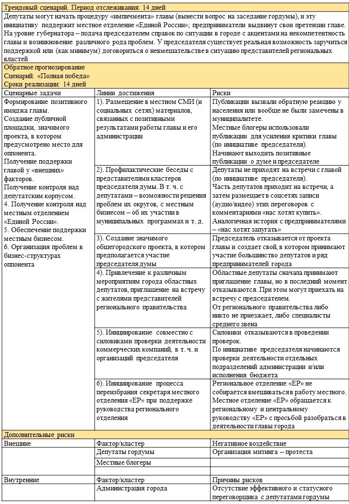 В качестве примера возьмем сценарий «Полная победа». В данной ситуации в качестве направлений потенциальных «диверсий» мы можем рассматривать линии достижений сценарных целей (см. таблицу 8). При этом возникающие риски описываются нами как возможная реакция оппонентов на действия «нашего» субъекта.