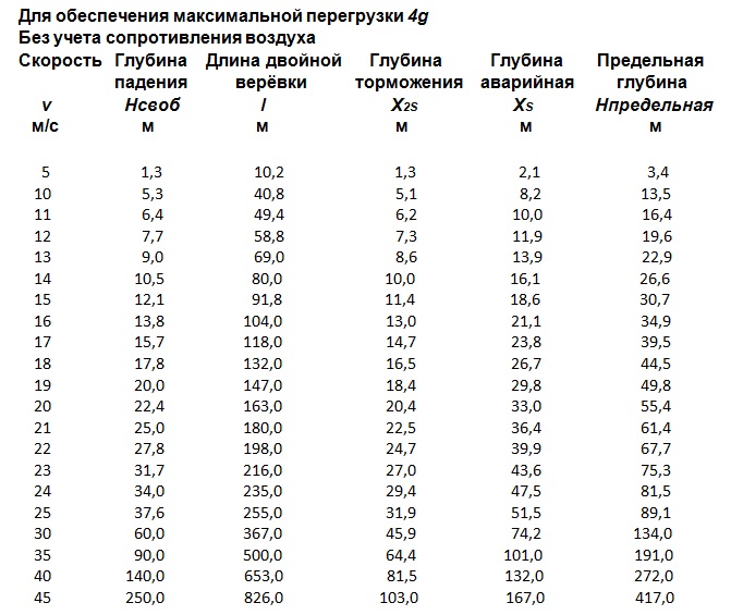 Итак, для заданных параметров рассчитаем длину требуемой двойной верёвки торможения l при разных достигнутых скоростях и соответствующих им глубинах завершения свободного падения без учёта сопротивления воздуха в процессе торможения. Далее определим глубины торможения: штатную X2S и аварийную XS. И, наконец, получим предельную расчётную глубину торможения Hпредельная. Полученные данные представим в таблице.