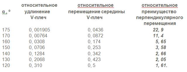 Ниже представлена таблица преимущества перемещения точки соединения V-плеч для непредельных углов перпендикулярной амортизации: