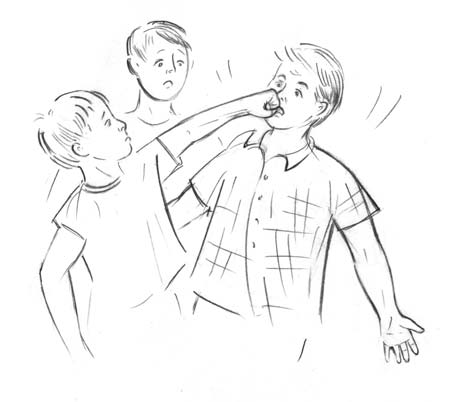 Серёжка ударил его по рукам, Витя тоже приготовился внести свою лепту в наказание «этого ябедника». Но тут случилось нечто невероятное и неожиданное для всех. У Кирилла в голове вдруг как будто что-то перемкнуло. Вместо страха, боязни, мгновенно появился гнев. Гнев, что его, ни в чем не виноватого, двое старших ребят зажали в угол … С отчаянием загнанного волка, он резко выпрямился, сжал кулак и что есть силы ударил Серёжку по лицу. Удар был действительно сильным и настолько неожиданным, что Серёжа отступил, назад чтобы не упасть, и закрыл лицо руками. Витя от удивления открыл рот. Когда Серёга отнял руки, все увидели, что они были в крови. Удар пришёлся прямо в нос, и из него алым потоком хлынула кровь, заливая лицо, руки, одежду… Все оцепенели и никто не соображал, что, вообще, делать дальше. Через секунду Серёжа пришел в себя и с истошным рёвом: