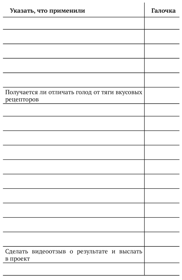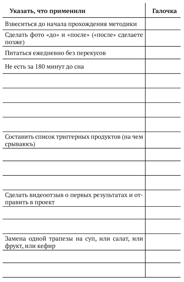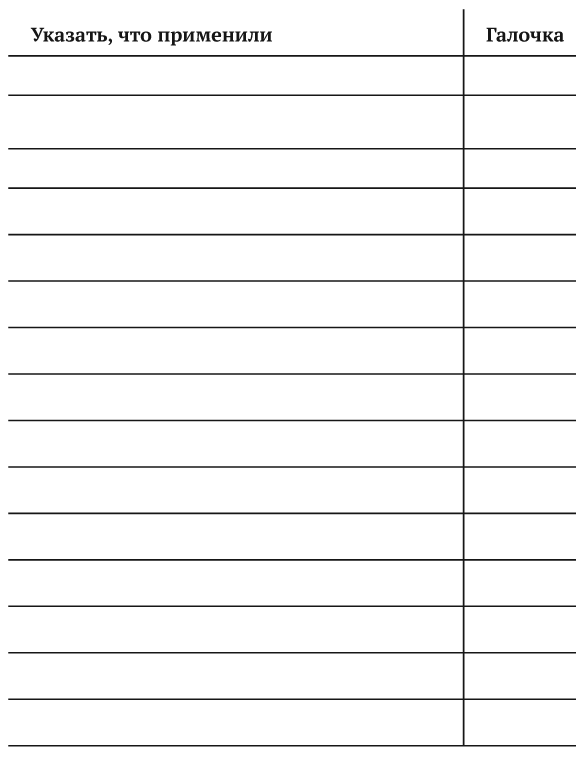 В столбике «Указать, что применили» в строчках с 4 по 36 пишем то, что применили из методики. В столбике «Галочка» ставим галочку, когда это применили, не забываем, и это работает.