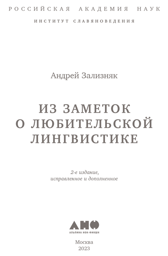 Историки лингвистических учений называют тексты, которым посвящена книга Зализняка, «фантастической лингвистикой»; используется также понятие «(псевдо)научный миф». Андрей Анатольевич Зализняк с присущим ему тактом назвал эту область словесности «любительской лингвистикой», воздержавшись, по крайней мере в названии, от более уничижительных характеристик. Впрочем, как-то ему полушутя возразили, что настоящий любитель (как и «дилетант», слово с такой же внутренней формой в итальянском) – это скорее не антоним профессионала, не воинствующий невежда, а прежде всего тот, кому его занятие интересно, кто получает от этого удовольствие, – и Андрей Анатольевич согласился. Кажется, эти черты его личности – удовольствие от занятий лингвистикой, от лингвистических открытий, от ювелирных тонкостей науки и неотрывно связанные с этим удовольствием шоковые ощущения от топорного «медвежьего» подхода людей, ничего о лингвистической науке не знающих, – во многом объясняют, почему появились работы, собранные в этой книге.