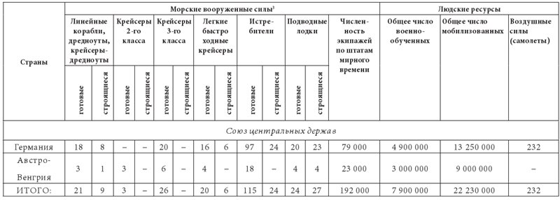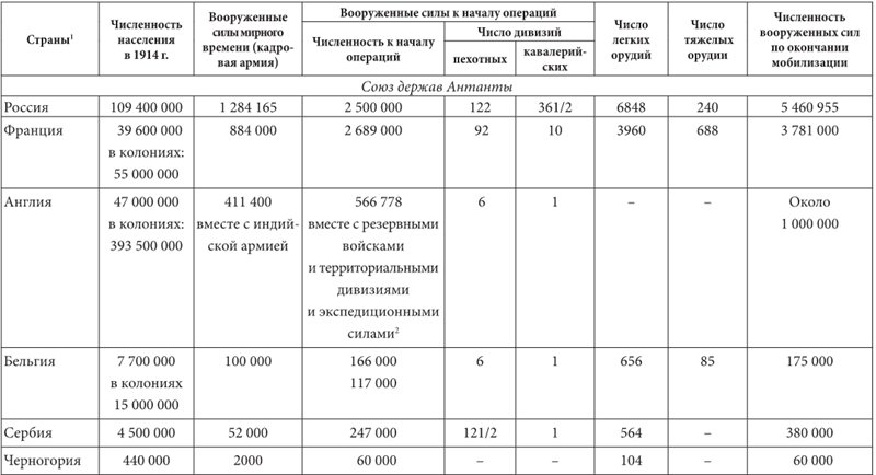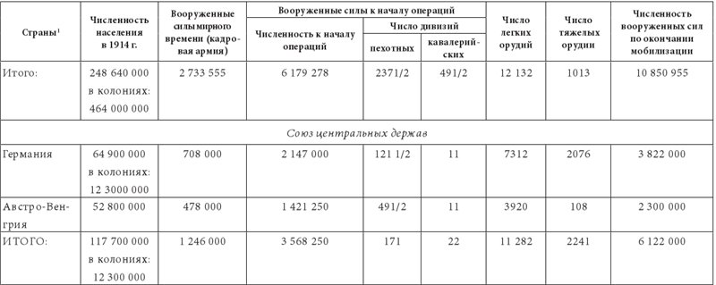Приводимая ниже таблица дает лишь некоторые отправные данные о численности сухопутных вооруженных сил обоих союзов к началу войны на основании новейших статистических сведений. В действительности же военная мощь любой страны слагается из целого ряда факторов, среди которых одна голая численность живых сил не дает полного представления о могуществе государства. И к началу мировой войны ни одно государство не предвидело размеров грядущей борьбы, особенно ее продолжительности. В результате воюющие стороны, имея только боеприпасы мирного времени, столкнулись во время самой войны с целым рядом неожиданностей, преодолевать которые приходилось уже наспех в процессе борьбы (2).