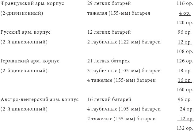 7. В отношении снабжения артиллерией, в особенности тяжелой, в выгодную сторону выделялись германская и отчасти австро-венгерская армии. Сравнительное количество артиллерии в четырех крупнейших армиях представлялось так: