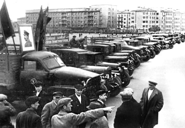 Колонна автомашин – шефская помощь предприятий Ленинграда – направляется на строительство метрополитена. 3 сентября 1947 г.