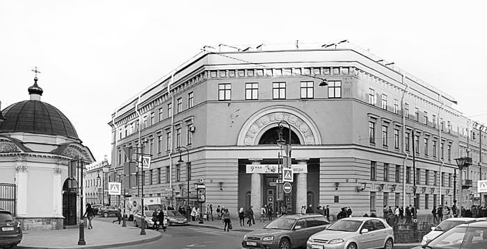 Так и случилось, наземный вестибюль «Владимирской» разместили на первом этаже перестроенного четырехэтажного здания, принадлежавшего Владимирской церкви (архитекторы A.X. Пель, В.Ф. Геккер, Ф.Ф. Соловьев и Н.Н. Никонов). Кстати, в проекте 1947 г. на «Владимирской» предусматривался второй выход, на площадь Пяти углов, на месте дома № 18 по Загородному проспекту.
