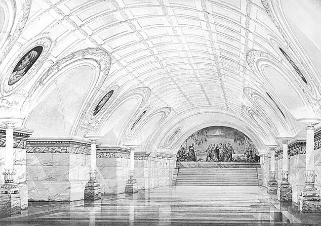 Подземный зал станции «Владимирская» у Васильковских выглядел очень нарядно: над пилонами из белоснежного мрамора портреты владимирских князей, оригинальные светильники в виде чаш на столбах, множество лепнины, красивый рисунок пола, в торце – сцена народного гуляния с неизменными березками. Если бы этот проект реализовали, то «Владимирская» стала бы одной из красивейших станций в нашем городе.