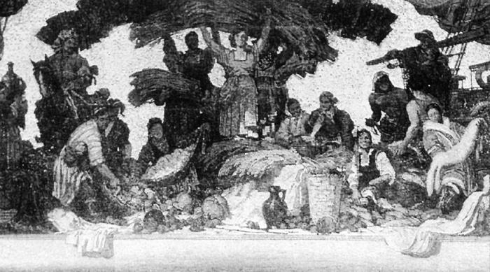 Возможно, на тематику картины повлияло близкое соседство Кузнечного колхозного рынка. 18 персонажей, граждан Советского Союза, в ярких национальных костюмах, улыбающихся, с открытыми лицами глядят на нас с картины. У их ног горы фруктов, овощей, копны колосьев, бутыли с вином. Слева таджик в цветном халате высыпает фрукты из большой корзины, рядом киргиз на лошади прижимает к себе ягненка; справа представительница народностей Севера держит шкурку песца, а за нею возвышается целый корабль и три балтийских рыбака укладывают снасти. В центре панно колхозники на вытянутых руках держат снопы – любимая поза советских художников и скульпторов. Но, в отличие от многочисленных произведений того времени, у Мыльникова композиция тщательно проработана, а каждый персонаж индивидуален.