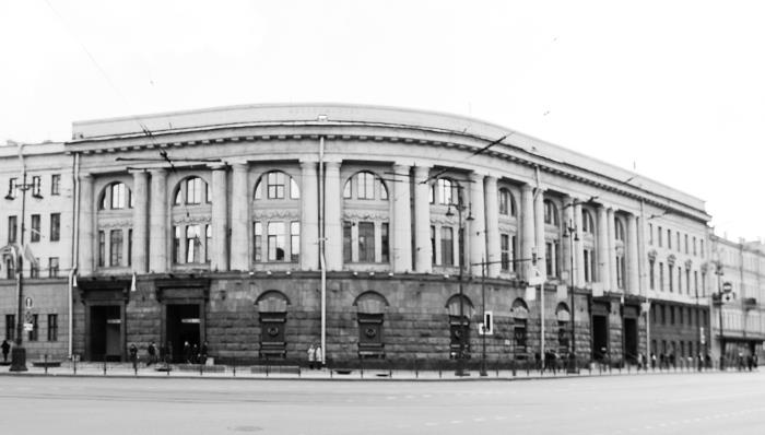 Высокий цокольный этаж выполнен из мощных необработанных рустованных блоков темно-красного гранита Токовского месторождения, декоративные окна закрыты красивыми решетками. Вход в вестибюль устроен со стороны Московского проспекта, выход – на Загородный проспект, они выполнены в виде огромных порталов из полированного гранита той же породы, органично вписавшихся в рустованный камень фасада. Стены второго и третьего этажей украшены сдвоенными дорическими колоннами с каннелюрами и отделаны желтым известняком.