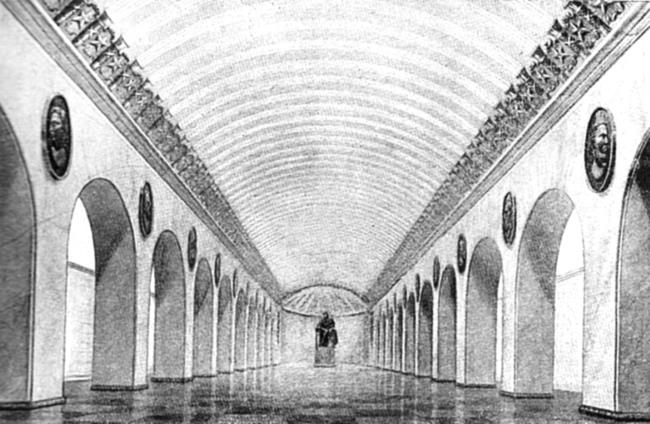 * * *На закрытом конкурсе 1948 г. свои проекты подземного зала станции «Технологический институт» представили действительный член Академии архитектуры УССР Е.И. Катонин, архитекторы А.К. Барутчев и Я.О. Рубанчик, член-корреспондент Академии архитектуры СССР Б.Р. Рубаненко и архитектор Л.Г. Голубовский. Проект Рубаненко – Голубовского из-за обилия скульптуры напоминал музейный зал, вдоль стен на высоких квадратных пьедесталах стояли бюсты ученых. Городской архитектурный совет рекомендовал к дальнейшей разработке проект Е.И. Катонина «как дающий наиболее приемлемое решение».