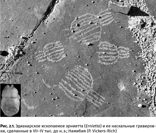 Среди троглодитов уже встречались палеонтологи. Таковыми их можно считать вовсе не потому, что они рисовали ныне вымерших зверей, и современные ученые охотно пользуются их подсказками, реконструируя прошлое. Древние люди собирали настоящие окаменелости. Кстати, не исключено, что и зарисовывали их. В Намибии, например, там, где распространены эдиакарские ископаемые, встречаются наскальные гравировки, очень похожие на эрниетту (Ernietta) и птеридиниума (Pteridinium). Предположительно, они высечены художниками в VII–IV тыс. до н. э. (рис. 2.1).