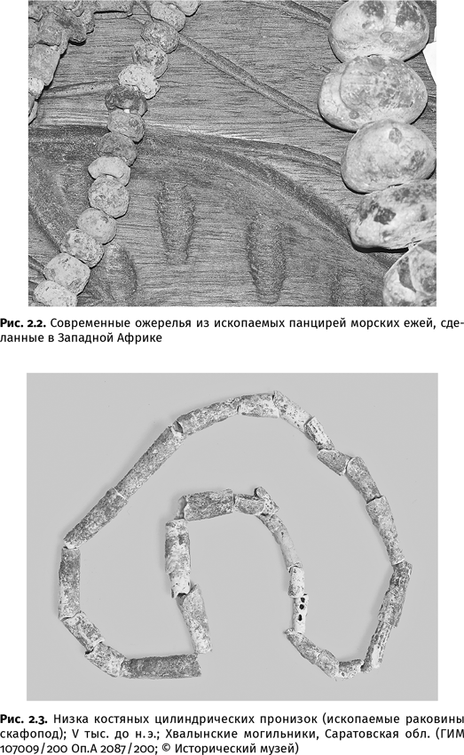 Не менее богаты окаменелостями и неолитические памятники, например Хвалынские могильники V тыс. до н. э., обнаруженные на берегу нынешнего Саратовского водохранилища на Волге. Здесь найдены трубчатые раковины серпулид и скафопод, створки глицимерисов и корбикол. Трубочки нанизывали на шерстяные нити – дырки-то в них уже были от природы – получались бусы (рис. 2.3).