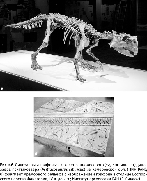 Наша современница Эдриенн Мэйор из Стэнфордского университета нашла ископаемые прообразы грифона – это небольшие рогатые динозавры пситтакозавр (Psittacosaurus) и протоцератопс (Protoceratops). Их костями изобилуют меловые отложения Монголии и Кемеровской области. Значит, по мнению американской исследовательницы, горбоносые черепа могли видеть и скифы, кочевавшие здесь в VI–V вв. до н. э. Слухи о странных существах с клювом орла и лапами льва дошли от сибирских кочевников до их сородичей, обживших Северное Причерноморье, от тех попали в местные греческие полисы. А греческие ювелиры и художники воплотили мифические образы в золотых нашейных гривнах и агатовых камеях, росписи керамических сосудов и мраморных изваяниях. Впрочем, это не первая и не самая интересная небыль о грифонах за прошедшие два с половиной тысячелетия. Конечно, родственники протоцератопсов и крыльями обзавелись, но сами-то эти ящеры окрыленностью не отличались (рис. 2.6). Правда, перья на хвосте отрастили.