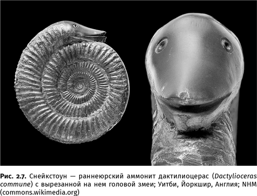 По мере развития цивилизации необходимость добычи строительного камня и руд заставляла людей все чаще обращаться к окаменелостям и задумываться об их природе, хотя бы исходя из знаний своей эпохи. Не случайно ведь похожи свернутые спиралью ракушки на змей (для пущего сходства можно им и глазки вырезать, рис. 2.7), а другие, расчлененные, на скорпионов? Подобное лечится подобным, и «змеиные камни» (аммониты) дробили для изготовления противоядия от змеиного укуса, а «скорпионные камни» (панцири трилобитов) – от скорпионьего.