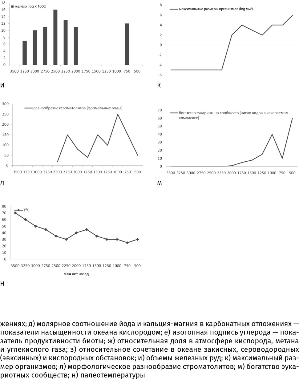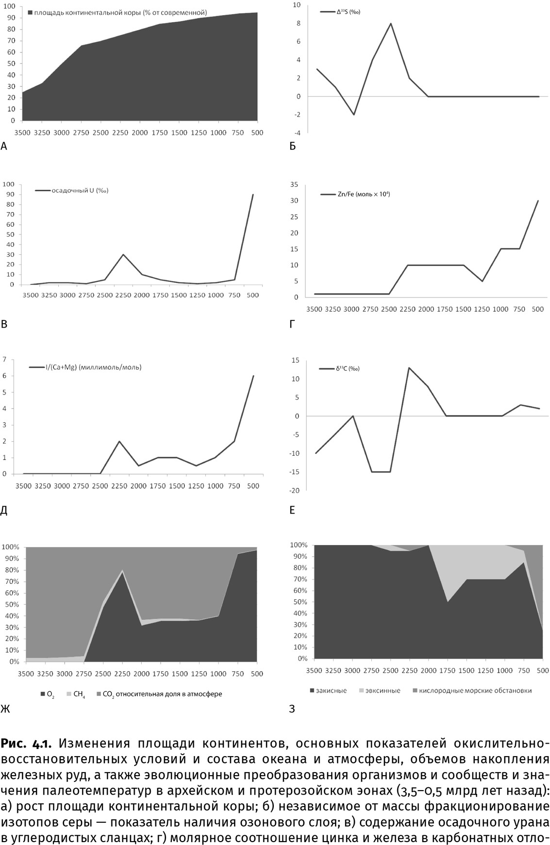 Опираясь на расчеты и особенности озер Дон-Жуан, Магади и Натрон, можно предположить, что архейский СаCl2-океан был кислым (рН = 5,5) и позднее стал щелочным. Это очевидно не так. Моделирование континентального стока, исходя из доступного для выветривания ряда горных пород и бескислородного состава атмосферы, показывает, что в океане катионы Fe2+, которые к тому же поступали из гидротермальных источников, должны были преобладать над Са2+, тем более над Mg2+ и Na+. Кроме того, с суши в больших объемах выносился бикарбонат (НСО3–). Бикарбонат быстро нейтрализовал ионы Са2+, Mg2+ и Na+, что и способствовало образованию обильных карбонатов этих металлов. Так, благодаря закисному железу, которое оставалось в растворе, и карбонатно-бикарбонатному буферу океаническая среда поддерживалась ближе к нейтральной (рН = 5,7–6,9). Это не исключало появления отдельных кислых водоемов вблизи вулканически активных островов.
