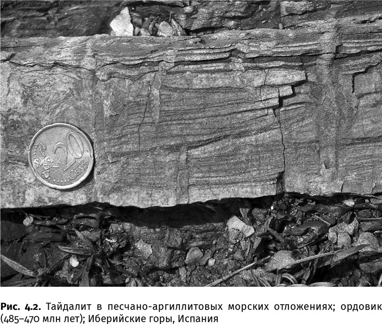 Например, гигантские нагромождения тайдалитов (от англ. tide – морской прилив и отлив). Ведь будь орбита Земли 4–3 млрд лет назад ближе к Солнцу или Луна ближе к Земле, по земной поверхности прокатывались бы мощнейшие приливно-отливные течения. Однако тайдалиты – морские слоистые отложения, состоящие из повторяющихся ритмов песчаник-алевролит-аргиллит (от наиболее грубозернистой разности, формирующейся в начале приливного цикла, до самой мелкозернистой, венчающей его; мощность отдельных слойков составляет от 0,5 до 8 см), даже архейские, ничем (почти ничем) не отличаются от современных (рис. 4.2). Небольшая разница, конечно, наблюдается – годовая ритмика несколько другая.