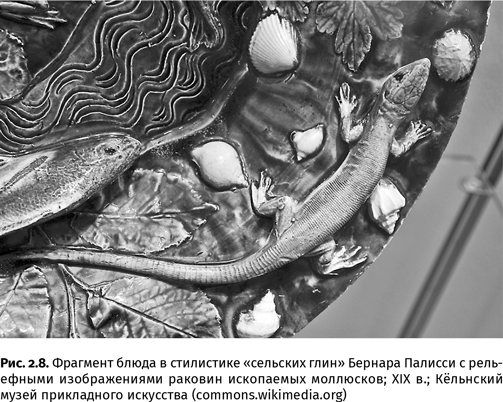 Палисси, известный изобретатель особой разновидности керамики – «сельских глин» – и создатель керамических шедевров (гротов и блюд), на которых великолепно изображал морских животных, знал и вымерших (рис. 2.8). (Именно его искусство, восхищавшее высоких покровителей, спасло нераскаявшегося гугенота в Варфоломеевскую ночь.) В 1580 г. в книге «Восхитительные суждения о природе земли и источников…» он писал: «…законник показал мне два камня, совершенно похожих по форме на панцирь морских ежей (эхиноидов). Названный законник верил, что камни вытесаны каменщиками, и был весьма удивлен, когда я дал понять ему, что они естественные, поскольку я уже посчитал их панцирем морских ежей, которые с течением времени обратились камнем»[10]. Художник сам изготовлял глиняные слепки с раковин разных существ и понимал, что всего-навсего повторяет процесс, давно осуществляемый природой. (Правда, сам он никогда посуду керамическими ископаемыми не украшал. Многие «шедевры Палисси», которыми гордятся музеи, – это искусные подделки, создававшиеся его подражателями вплоть до середины XIX в., они отличаются по составу глазурей и… фаун.)