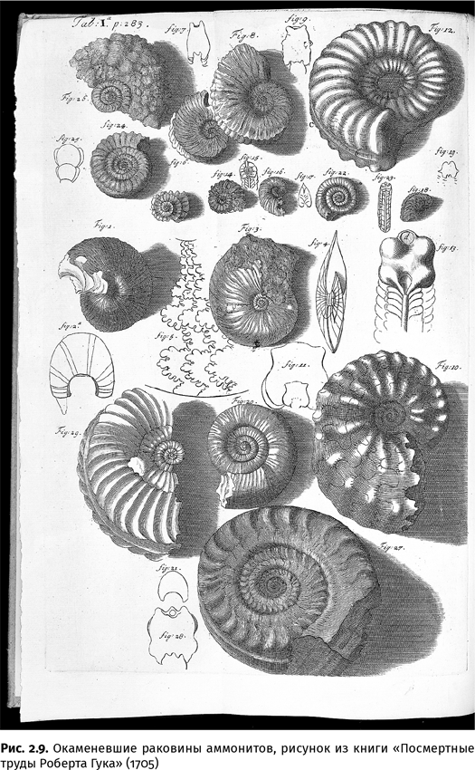 Современник философа Роберт Гук (чью фамилию все помнят хотя бы по «школьному» закону Гука), куратор экспериментов (позднее секретарь) при только что созданном Королевском обществе Лондона, в книге «Микрография» (1667) описал процесс петрификации – превращения распавшейся дубовой древесины в камень благодаря осаждению минералов на растительных тканях. Сходным образом, рассудил физик, «некий ил или глина, либо минерализованная вода или иная субстанция может заполнить раковину»[11], и она превратится в окаменелость. Так могли получиться, например, «своего рода наутилусы» – аммониты (рис. 2.9). И значит, это моллюски, а не окаменевшие со святого перепуга змеи и не забава природы. В прозорливой фразе о петрификации особенно хочется отметить и запомнить «некий ил или глину». Почему? Пройдет еще 350 лет, уложенных здесь примерно в 35 страниц, и узнаем.