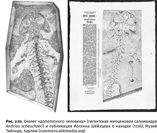 С приходом нового века в восприятии ископаемых остатков обывателями и учеными мало что изменилось. Так, медик Иоганн Якоб Шёйхцер из Цюрихского университета в книге с удивительным титулом «Жалобы и причитания рыб» (1708) настаивал от лица ископаемых рыб на том, что окаменелости суть остатки водных животных, высохшие после потопа. Здесь впервые появились изображения эоценовых рыб из богатейшего местонахождения Монте-Болька под Вероной. А скелет гигантской миоценовой саламандры, найденный в Швейцарских Альпах, с легкой руки доктора медицины превратился в останки нераскаявшегося грешника – Homo diluvii testis (лат. «человек, потопу свидетельствующий»; рис. 2.10). Саламандра возрастом около 10 млн лет теперь называется Andrias scheuchzeri и принадлежит к роду, существующему в Восточной Азии до сих пор. И потоп, значит, пережила…