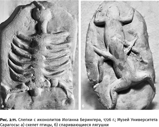 Иоганн Берингер, декан медицинского факультета Вюрцбургского университета и главный медик при герцоге Франконии, любил прогуляться по окрестным мергелистым оврагам родного Вюрцбурга и поискать интересные камушки. «Добрые» университетские коллеги быстро поняли, как можно осчастливить декана, и начали подкидывать ему кунштюки, вырезанные на камнях, причем довольно грубо (известковые мергели до сих пор используются для каменных поделок и подделок). Сначала это были изображения, напоминавшие аммониты. Доверчивый Берингер принял их за настоящие, и вскоре в оврагах появились каменные спаривающиеся лягушки, цветущие растения, только что вылупившиеся птенцы и даже парящие ангелы и летящие кометы (рис. 2.11). Похоже, что профессора географии и алгебры (их должности известны благодаря документам судебной тяжбы) не поскупились на производство: было вырезано более 2000 псевдоокаменелостей. В довершение всего Берингер нашел таблички с письменами, похожими на иврит, и со своим собственным именем. Декан обрадовался пуще прежнего и в 1726 г. выпустил весьма дорогую книгу с тщательно выполненными литографиями 204 находок, которые помпезно назывались иконолитами, поскольку послужили своего рода «черновиками Господа Бога». Творец, оказывается, избрал для своих экспериментов Франконию! На фронтисписе фолианта красовалась гора иконолитов, увенчанная гербом местного герцога. По иронии судьбы именно герцог стал одним из тех, кто засомневался в истинности слов своего «главврача», а иконолиты с тех пор стали называть врулитами.