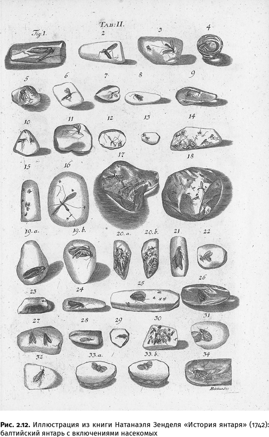В конце концов на янтарь обратил внимание Натанаэль Зендель, доктор медицины, практиковавший в родном Эльбинге (ныне Эльблонг, Польша). Да и как было не заметить камень, которым буквально жил прибалтийский городок? К 1742 г. Зендель изучил 250 инклюзов из собрания польского короля Августа II Сильного и посвятил им солидный том «Historia succinorum» (лат. succinctus – плотный; одно из имен янтаря, которое закрепилось в названии его балтийской разновидности – сукцинита). Десятки гравюр представляют каждый образец с двух сторон (он же прозрачный): многоножки, мокрицы, пауки, крылатые ручейники (автор называл их мотыльками) – любого можно узнать без труда (рис. 2.12). В отдельной главе автор разоблачал фальсификаты, которыми в несметном количестве торговали еще со времен Марциала: куда как дороже можно продать «запеченную» в куске янтарной смолы змейку или лягушонка, чем паука или таракана. Это первое научное издание о палеонтологических находках в янтаре эоценовой-олигоценовой эпох быстро стало раритетом. Востребованной оказалась и коллекция: она передаривалась друг другу монаршими особами, пока не исчезла где-то при дворе мантуанских герцогов.