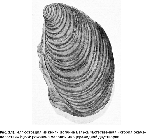 Лишь во второй половине XVIII в. появился первый палеонтолог, профессионально изучающий позвоночных, и вышла первая настоящая книга по палеонтологии (даже раньше, чем наука обрела свое название). Это был многотомник «Естественная история окаменения» с прекрасными цветными гравюрами, общим счетом 270 штук, изданный в 1768–1773 гг. за авторством Иоганна Эрнста Иммануэля Вальха в Нюрнберге. Чего в этой книге только не было! И гигантские вымершие двустворки – иноцерамы, и древние раки c креветками, и ходы морских животных, не говоря уж об аммонитах, белемнитах и прочих давно исчезнувших головоногих (рис. 2.13). Не обошлось, конечно, без казусов. Например, марганцевые детриты (особая форма роста марганцевых окислов, очень похожая на тончайшие многократно ветвящиеся ростки) тоже попали в разряд ископаемых организмов. Вполне простительное заблуждение для натуралиста XVIII столетия, если уж современные «профессионалы» их то и дело как следы жизни публикуют.