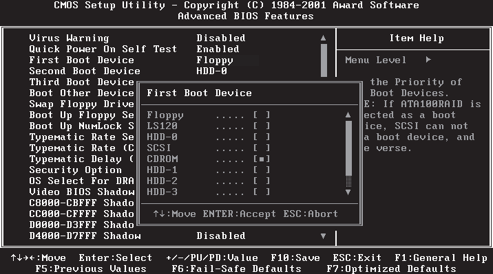 С помощью клавиш управления курсором переместитесь к варианту CDROM и нажмите Enter.