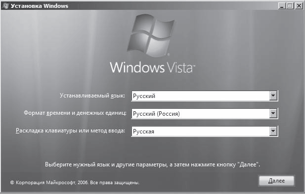 Сначала компьютер немного потрещит, пошумит – это на его жесткий диск копируются нужные для инсталляции файлы. Потом вы увидите первое окно установки Vista (рис. 1.3).