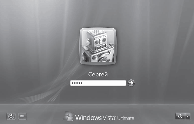 Все! Vista установлена! Вежливая программа инсталляции поблагодарит вас и предложит нажать кнопку Пуск для тестирования производительности системы. Это вещь важная, соглашайтесь. Компьютер еще немного потрещит, что-то там для себя выяснит, а затем появится экран входа в систему (рис. 1.7). Тут надо ввести имя пользователя и пароль, который вы указали в окне создания учетной записи (см. рис. 1.5), и нажать Enter. Привыкайте к этой процедуре – экран входа будет появляться каждый раз при запуске Vista.
