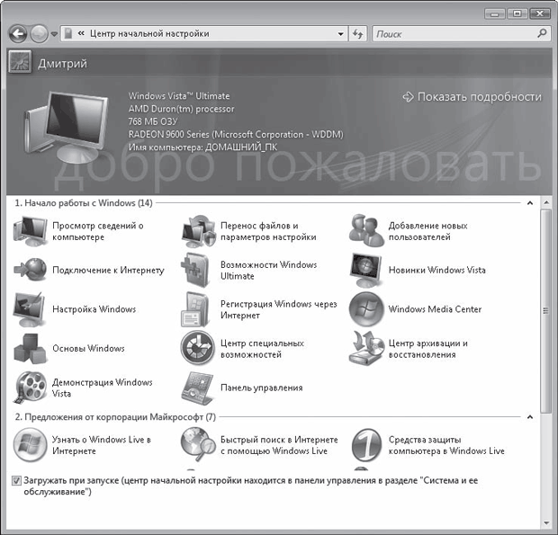 Словом, на это окно можно не обращать внимания. Более того, прежде чем закрыть его, снимите флажок Загружать при запуске, расположенный в нижней части окна. Если этого не сделать, Центр начальной настройки будет появляться при каждом запуске Vista. Все, закрывайте это окно.