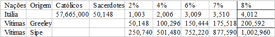 ● Importante! Lendo a declaração de monsenhor Betori, secretáriogeral dacongregação Episcopal italiana de Maio de 2002: “os padres pedófilossão um caso absolutamente marginal que não requer intervenções daparte das instâncias centrais da igreja italiana”, a suadeclaração pareciame bastante superficial. Por isso resolvi fazer aminha pesquisa. Na internet encontrei um sitio,http://retelabuso.org, onde demonstram: “segundo a projecção do colega irlandêsMark Vincent Healy, que na base dos dados emitidos pelascomissões governamentais do inquérito efectuado em todo mundoproduziu uma projecção do dado italiano, a consequência dos abusos naItália tem um potencial para ser o mais grande de qualquer país(…) segundo a percentagem dos sacerdotes considerados pedófilos2%, 4%, 6%, etc. Estiveram em condições de estimar o número dospadres pedófilos na Itália na base da tal percentagem (…) FrAndrew M. Greeley, professor de sociologia na universidade deChicago, que acredita que existam 50 vítimas para um sacerdote. A. W.Richard Sipe era assistente psicoterapeuta e psiquiatra no estadode Maryland. Se lês o relatório Sipe” afirma: “estudos bem consolidados mostram que o pedófilo médio tem 250 ou maisvítimas no decorrer da sua vida”. Aqui está a percentagem dospedófilos entre sacerdotes na Itália segundo os relatórios de Fr M.Greeley e A. W. Richard Sipe11 12 anos depois da declaração de monsenhor Betori. Nãocreio, que no decurso De 12 anos a situação podia mudar de forma tão drástica12 :