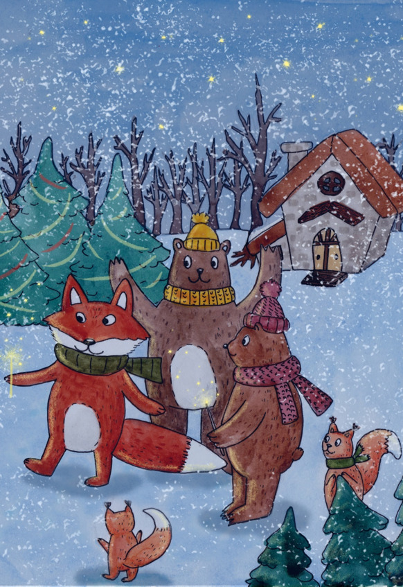 Вот вдали прогудел охотничий горн, и на поляну из зарослей выскочили несколько оленей. Белый снег летел из-под копыт, серебристыми искрами отражаясь в свете молодой луны. Один из них подошел к дому Зима и заглянул в окно своим большим карим глазом. Увидев, что хозяин домика спит, повернулся к остальным и кивнул. Музыка зашлась еще громче в кружащем вальсе. Через мгновение рыжеголовые сойки уже растягивали мерцающие гирлянды между деревьями. Чарующий вечер окутал разноцветными красками снежную поляну.