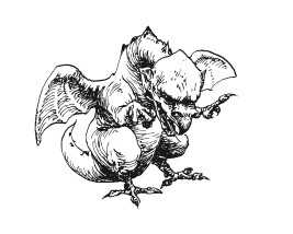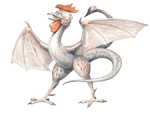 Существо страшенное, тело ящерицы, крылья нетопыря, а морду и ноги петуха имеющее. Два у него змеиных хвоста, одним он жертву хватает и оплетает, другим, коий жалом скорпионьим снабжен, убивает. Однако ж может убить и взглядом, чем василиску подобен. В том же и погибель его сокрыта – стоит куролиску зеркало показать, как он сам себя собственным взглядом уничтожает.